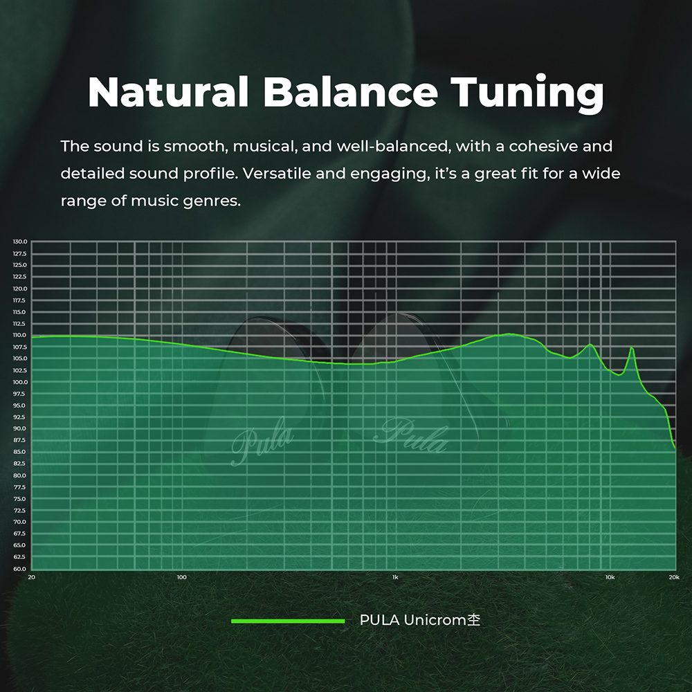 PULA has professionally adjusted the sound tuning of the Unicrom for a natural, smooth, balanced sound profile. It has a well-balanced three-frequency response with great cohesion across the frequencies. With its versatile and dynamic sound profile, PULA Unicrom complements different genres of music well. Its dynamic bass works well for Hip-Hop, EDM, while the warm, balanced profile complements Pop, Classical genres, and the detailed treble section makes Rock, Metal, etc. genres shine with the pair.