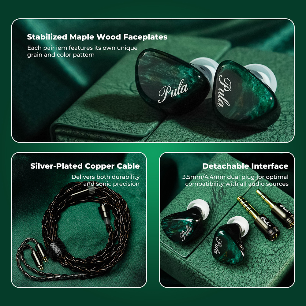 PULA has come up with an all-new pair of single-dynamic driver IEMs, the PULA Unicrom. The Unicrom features a specially-developed 10mm dynamic driver unit with a beryllium-plated diaphragm coil. Beryllium-plated diaphragm is extremely rigid yet super lightweight; it moves swiftly with incredible speed and precision. With the help of this 10mm DD unit, the PULA Unicrom produces a clean sound output with fast transients and ultra-low distortion. PULA has designed the Unicrom IEMs with lightweight and ergonomic ear shells. The pair boasts exciting looks with its solid-stabilized wooden face covers. PULA bundles the Unicrom with a high-purity silver-plated copper cable with a swappable termination plug system. PULA Unicrom promises a silky smooth, balanced sound profile that complements different genres of music well!!